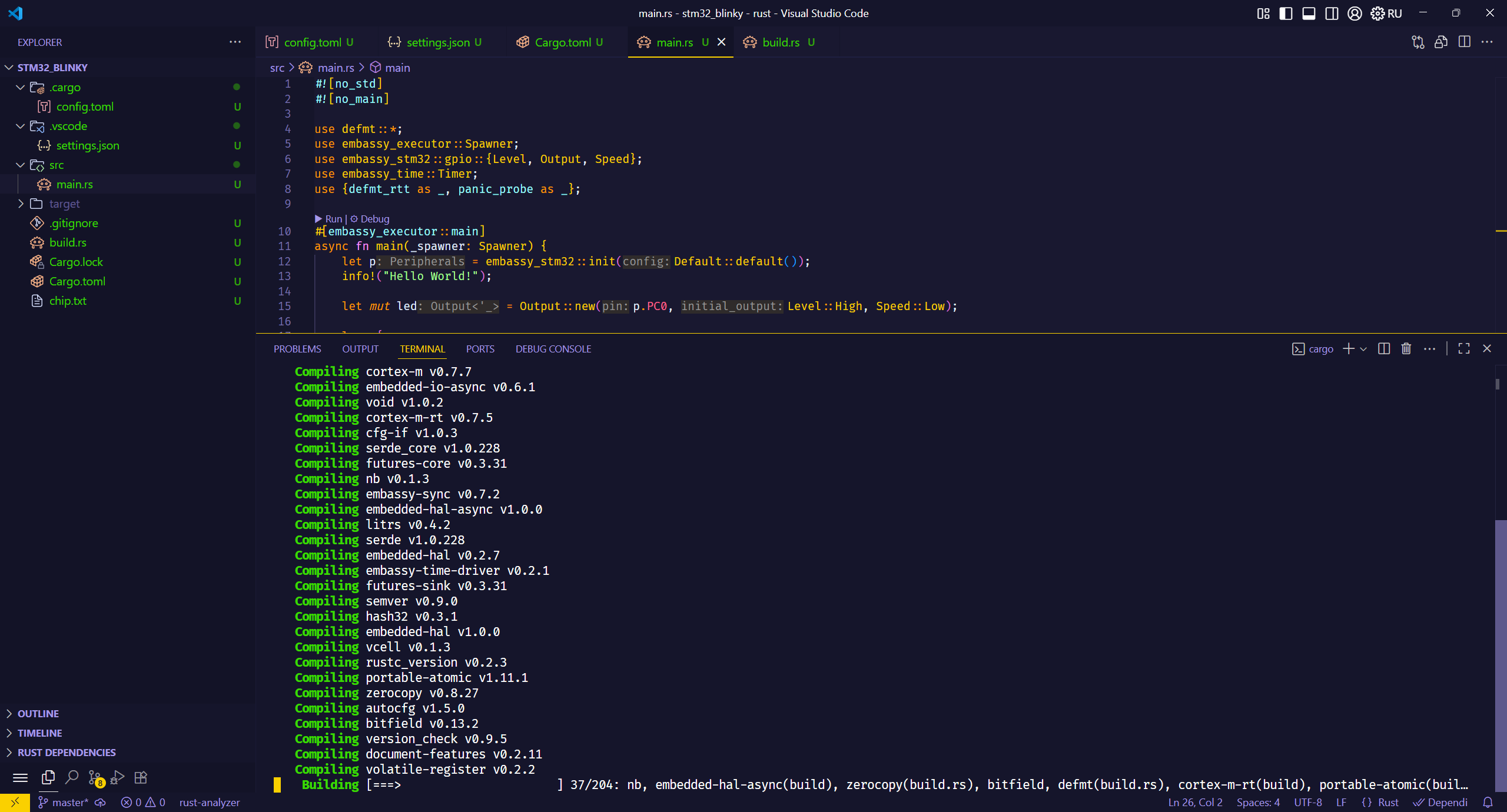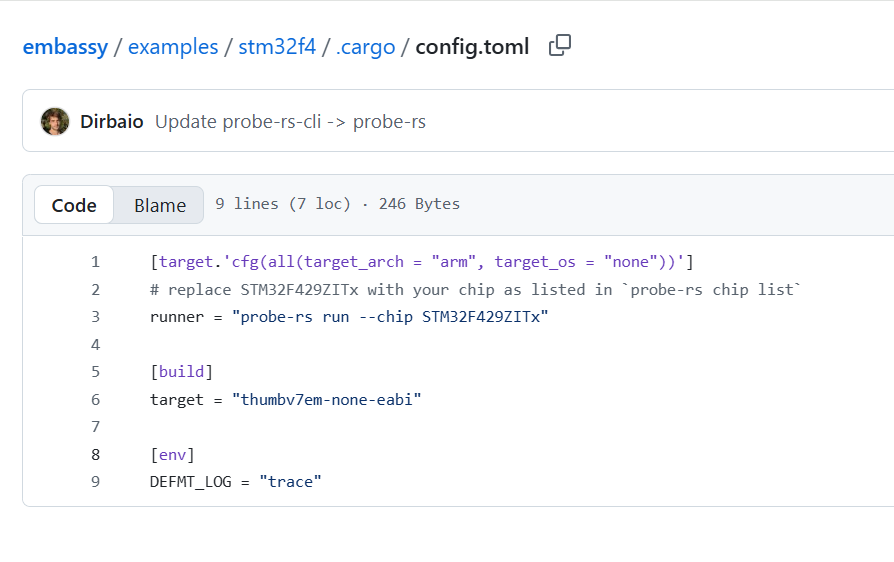 大家可以自行对比,进行移植。最简单的方式就是复制上面的配置文件到自己的Cargo.toml文件里,再将embassy-stm32 = { version = "0.4.0", features = ["defmt", "stm32f407ve", "unstable-pac", "memory-x", "time-driver-any", "exti", "chrono"] }这个依赖里的stm32f407ve修改为前文教大家适配的自己的芯片型号即可。