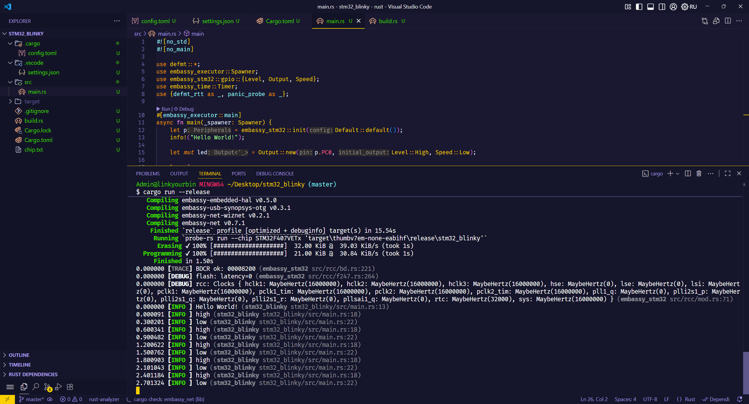 至此,恭喜你完成了在STM32单片机上,使用RUST语言点灯。