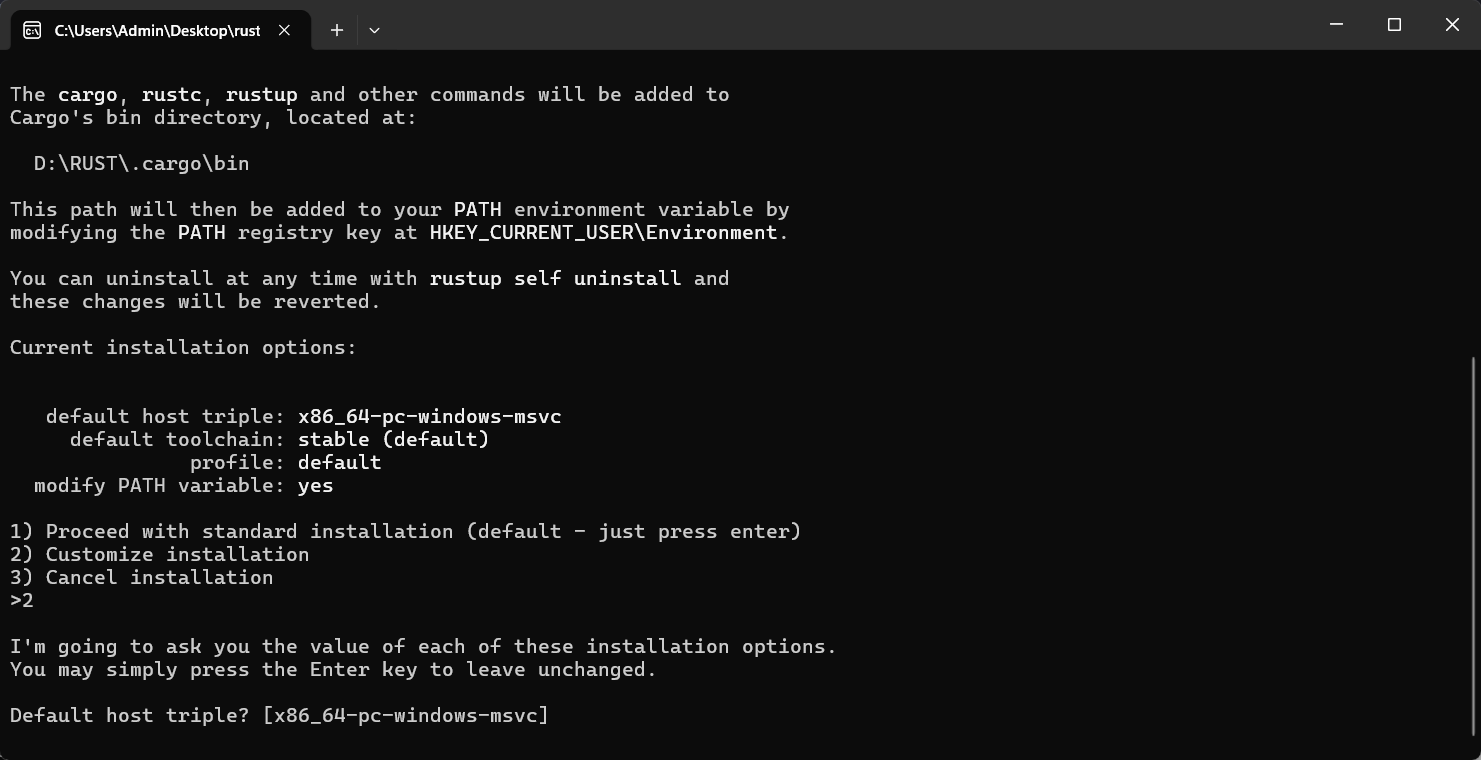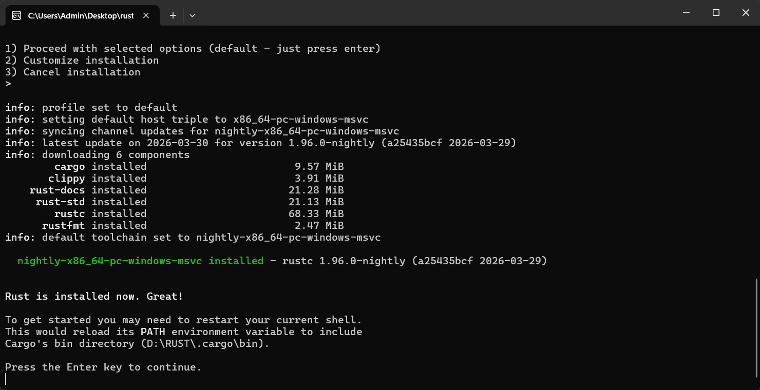 至此,Windows平台的Rust开发环境就算搭建完成了,这个环境可以理解为一个基础环境。你可以选择用其开发桌面应用、命令行工具,也可以在其基础上添加一些工具,用来做嵌入式开发。