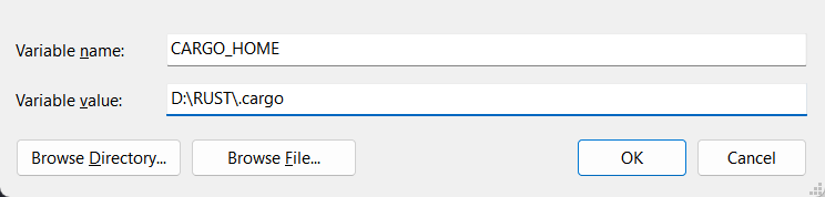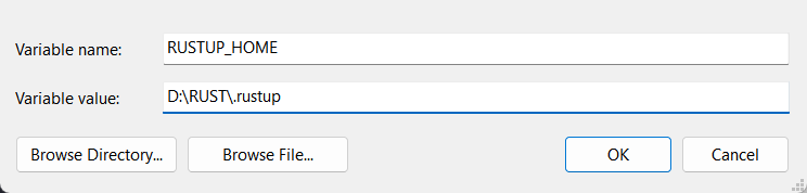 由于默认安装会将整个Rust工具链安装到C盘,考虑到部分开发者的C可能甚至没有512GB,故先配置环境变量,便于将Rust工具链安装到其他空间充裕的盘符。