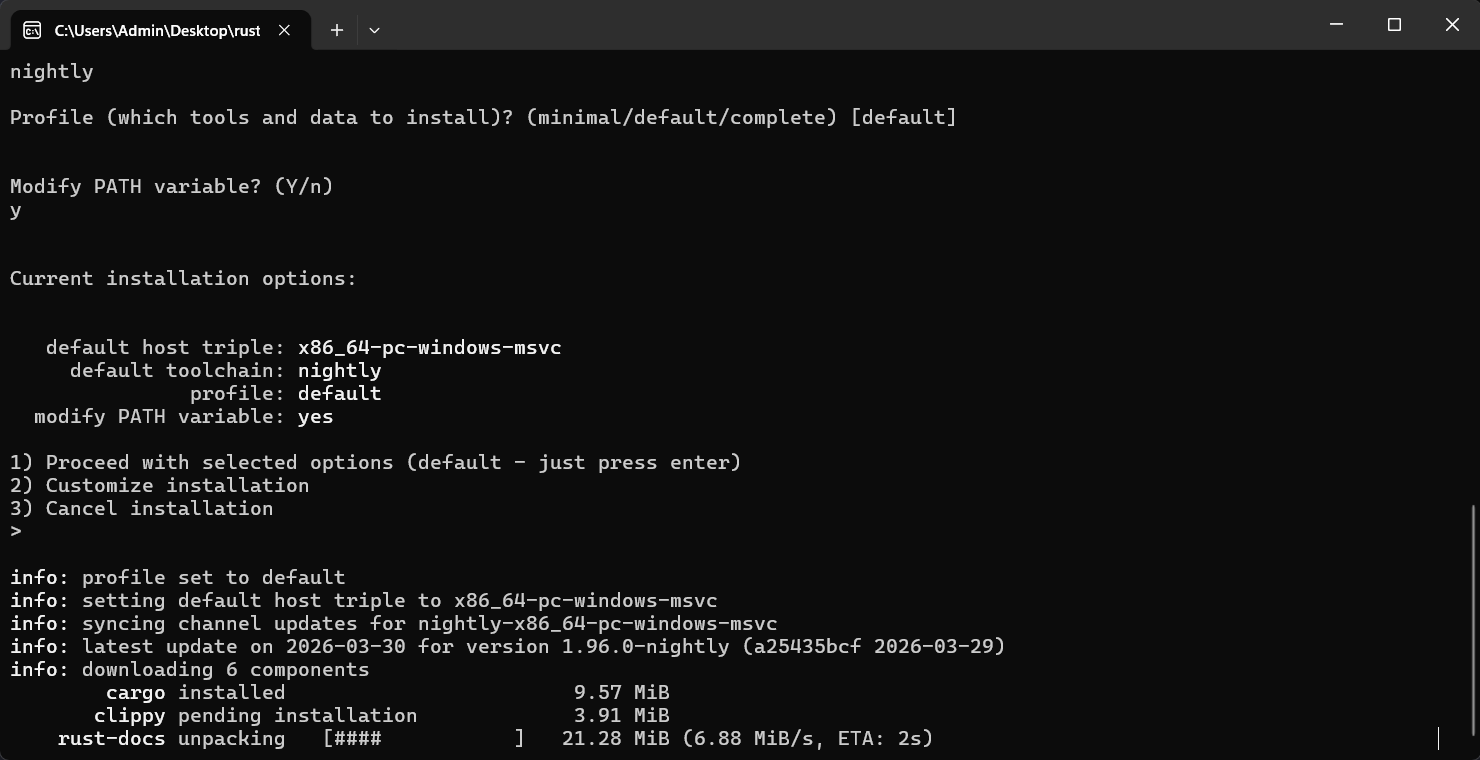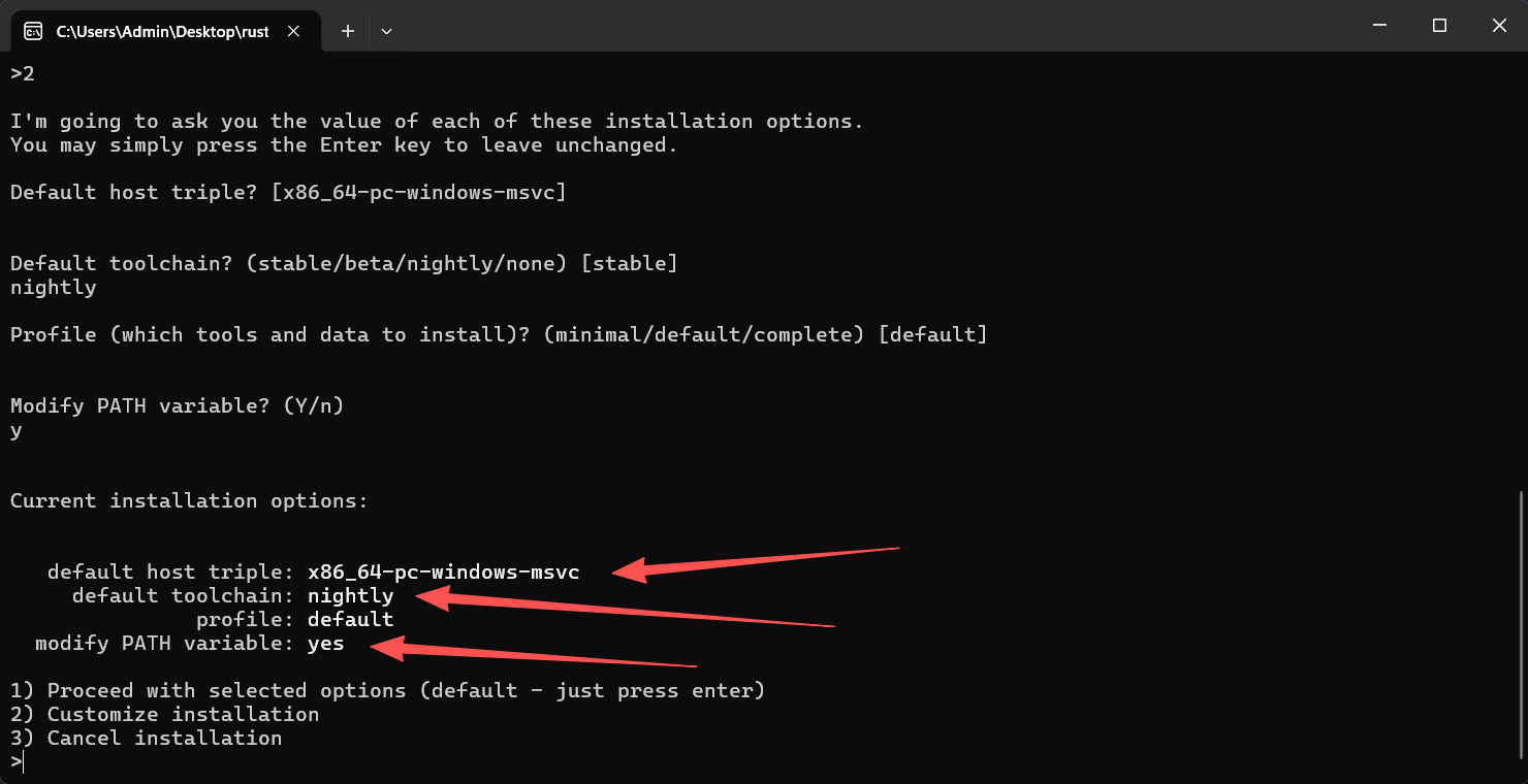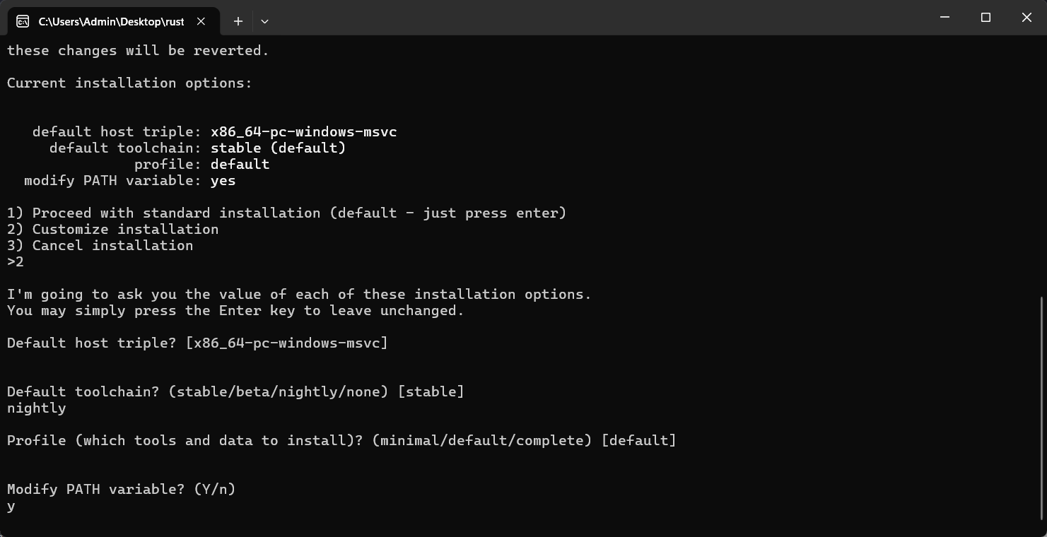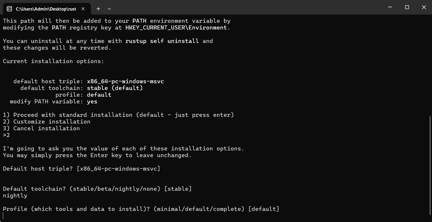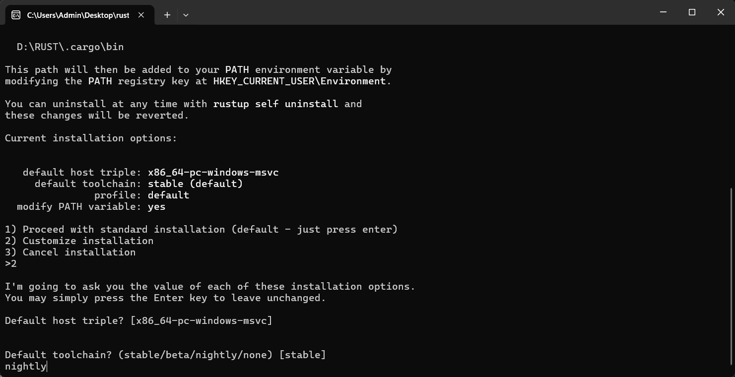 随后会弹出确认toolchain选择信息,此时输入nightly并且按下Enter。