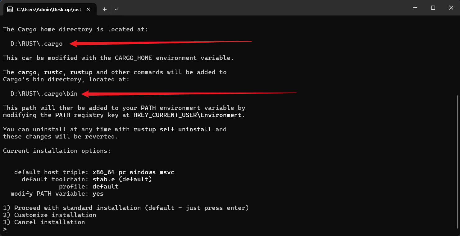 可以在终端里看到红色箭头指示的内容,则说明Rust工具链安装的环境变量配置成功。