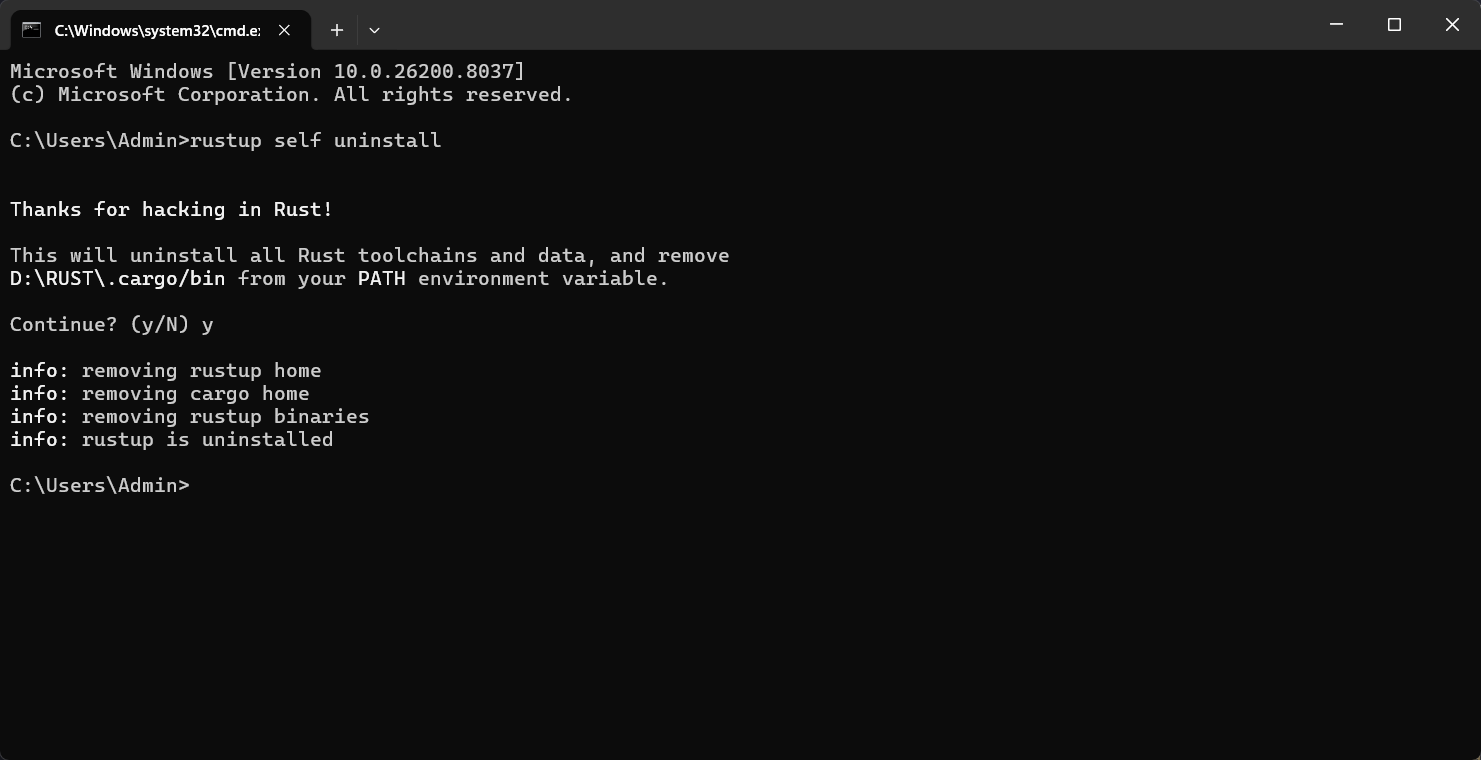 对于已经尝试过Rust开发,觉得Rust并没有帮你解决问题,也没有达到预期效果,想要卸载Rust的用户,只需要打开终端,输入以下命令,再输入y,按下Enter,便可卸载Rust。