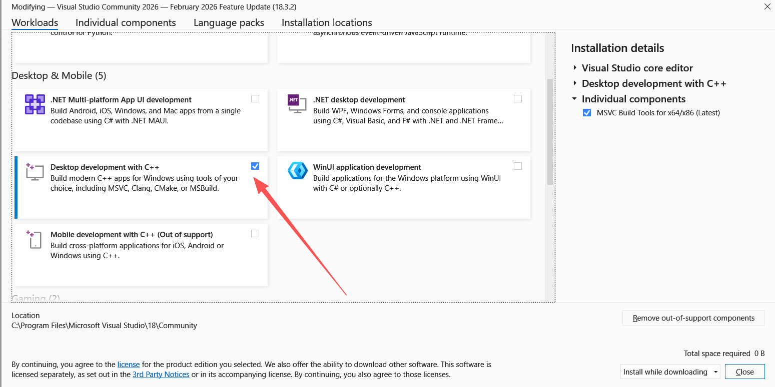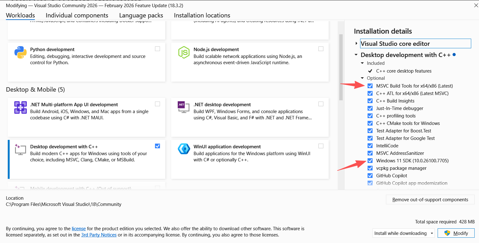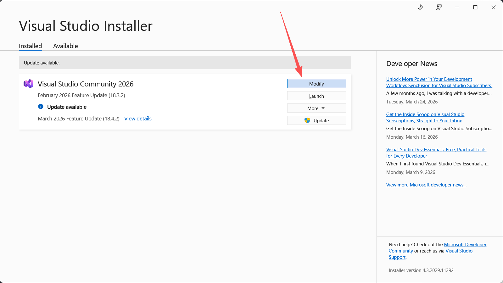 打开Visual Studio Installer之后,点击红色箭头指示的Modify。