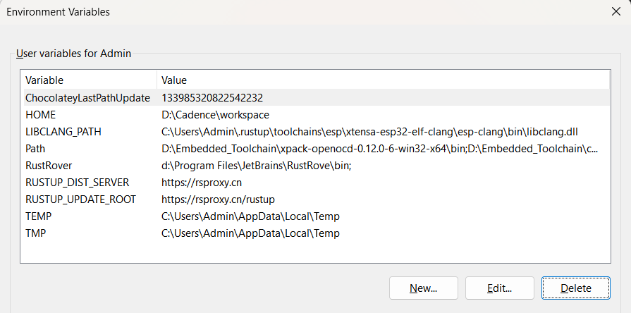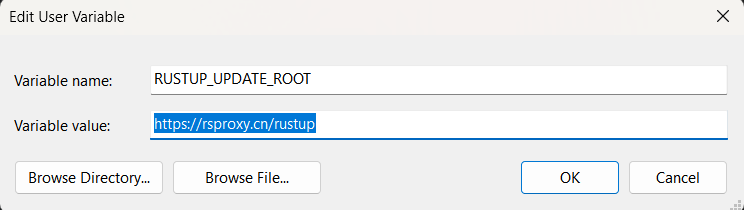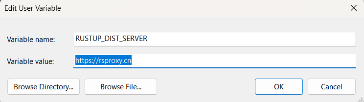 Edit/编辑,将RUSTUP_DIST_SERVER和https://rsproxy.cn,依次填入相应位置