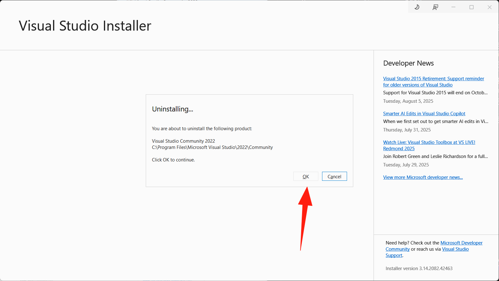 Desktop development with C++,点击Modify,之后的弹窗点击Yes即可
