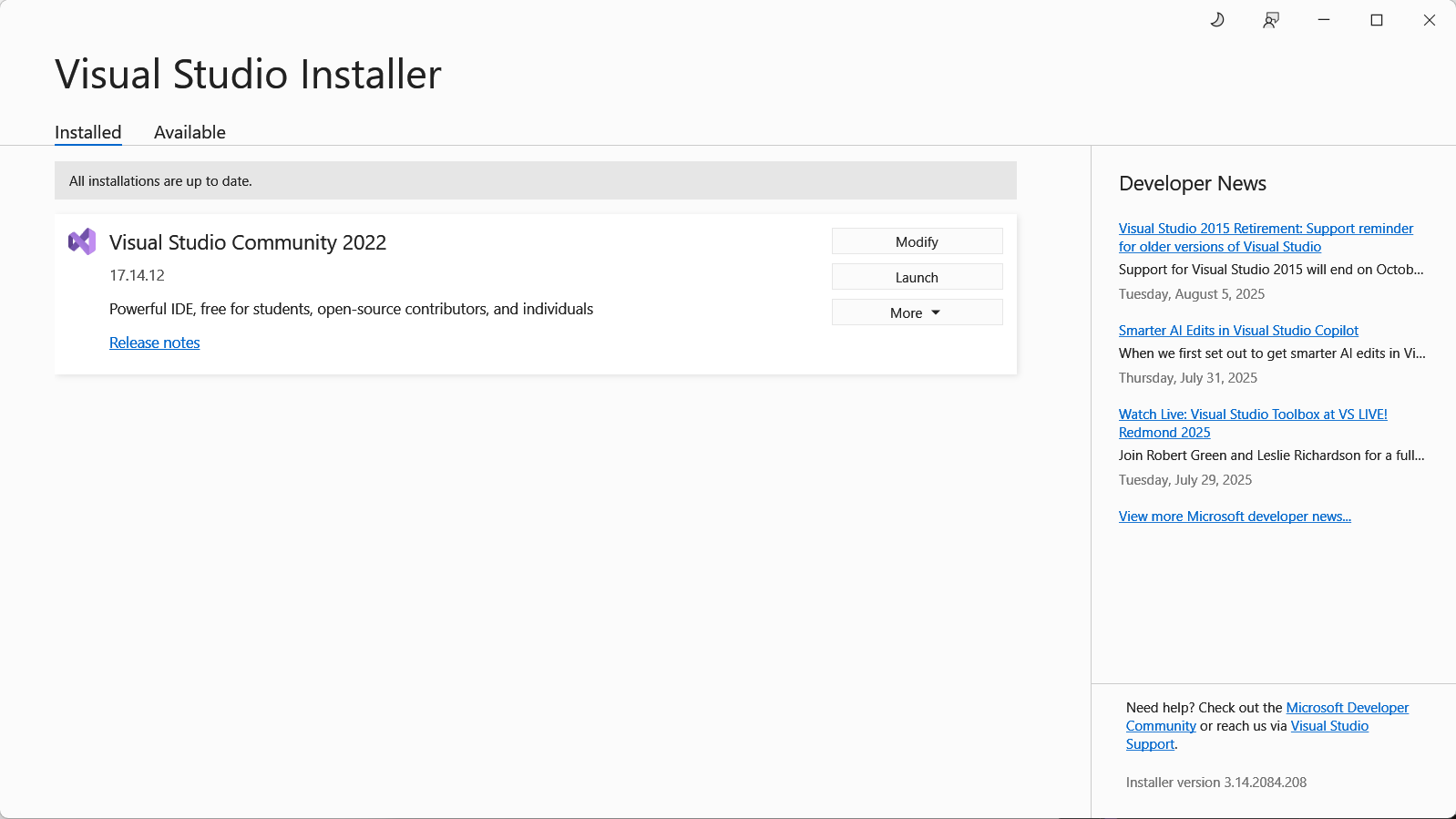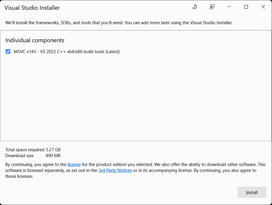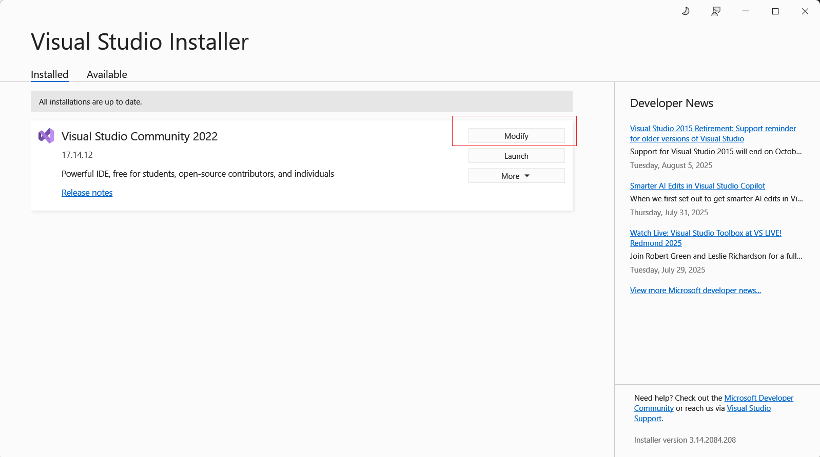 Visual Studio Installer,安装一些必备组件,之后编译项目或者工具的时候需要用到,点击Modify