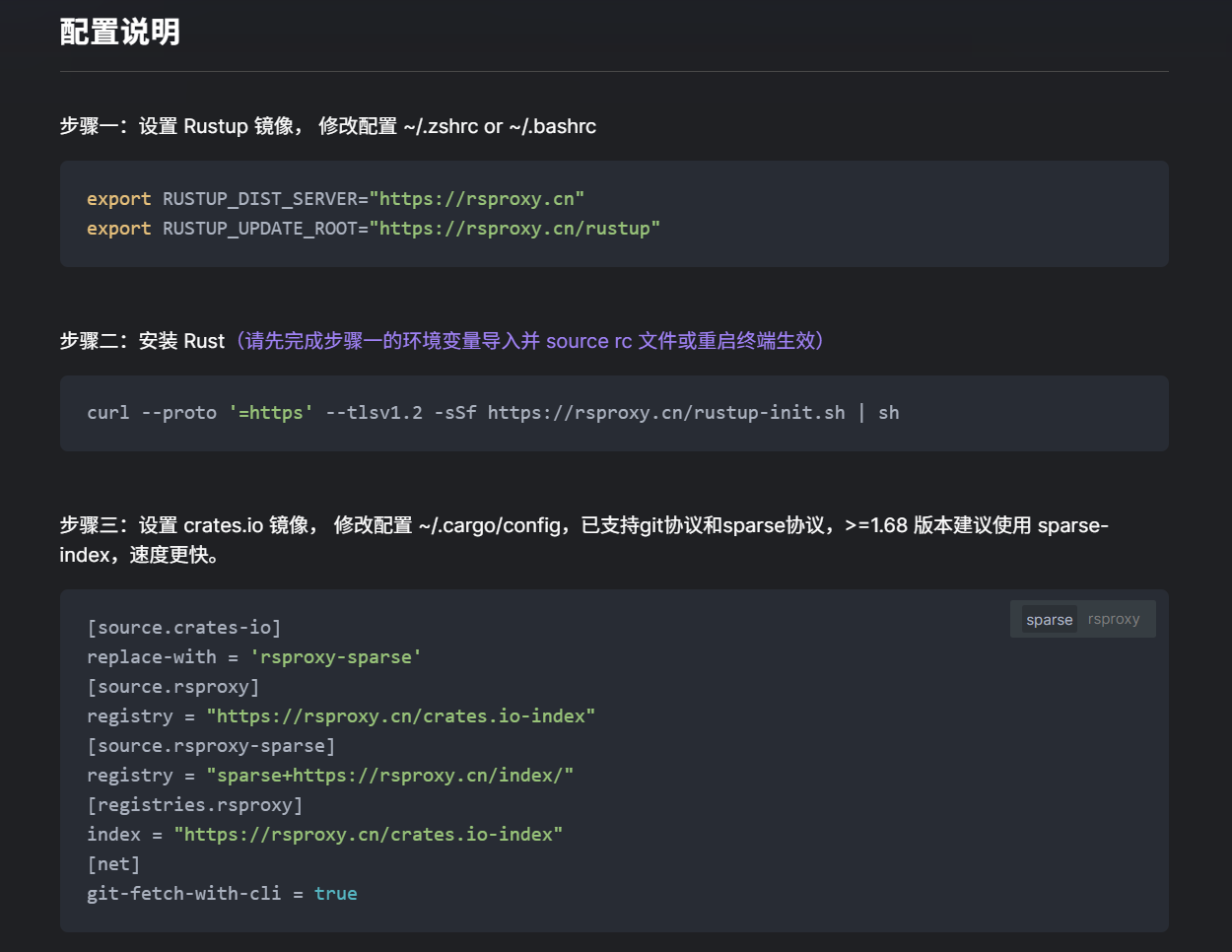 rsproxy.cn,可以看到其主页介绍的用法是Linux/MAC系统下的常用方式,我们侧重介绍如何在Windows系统下配置,Windows 10/Windows 11均可。